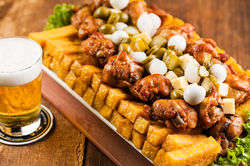 Calabresa e coração de frango na chapa, salame italiano, queijo, ovos de codorna, pepinos, azeitonas e cebolinha cristal.Porção Mista com Fritas